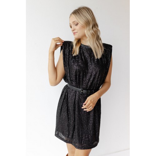 New Years Eve outfit? we think YES! this black sequin dress with the shoulder pads to give that power shoulder look is EVERYTHING! wear with a belt to cinch at the waist or don't for the relaxed fit!